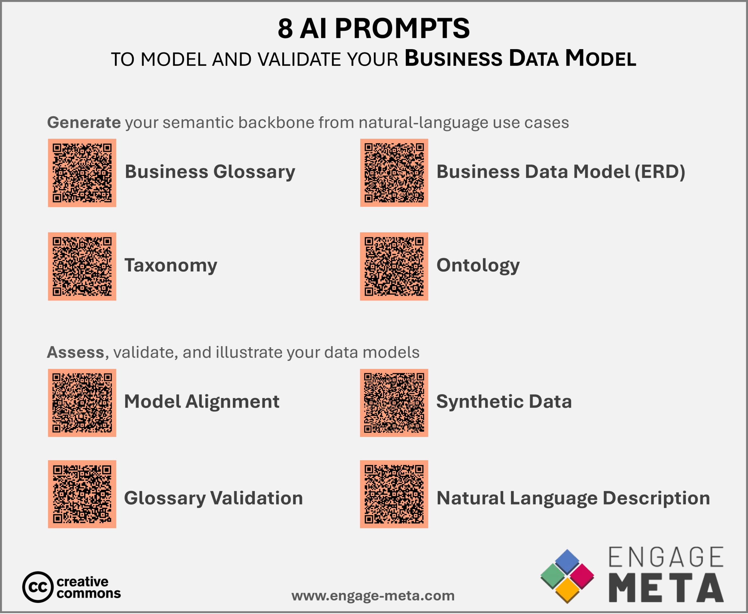 You can reduce your data modeling budget and timeline tenfold for your operational data (ODS, MDM) and ontologies (RDF-OWL). This is made possible by the power of AI, acting as an experienced modeling consultant, combined with the 8 prompts published by Engage-Meta.