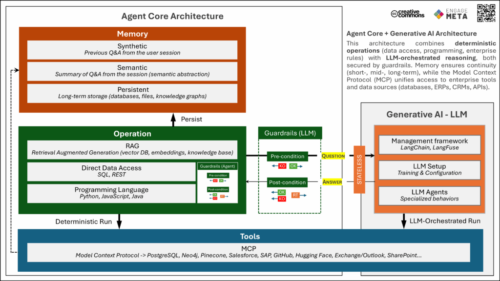 It shows how deterministic operations, LLM-orchestrated reasoning, guardrails, and the Model Context Protocol (MCP) come together to ensure continuity, governance, and interoperability across enterprise tools and data sources.